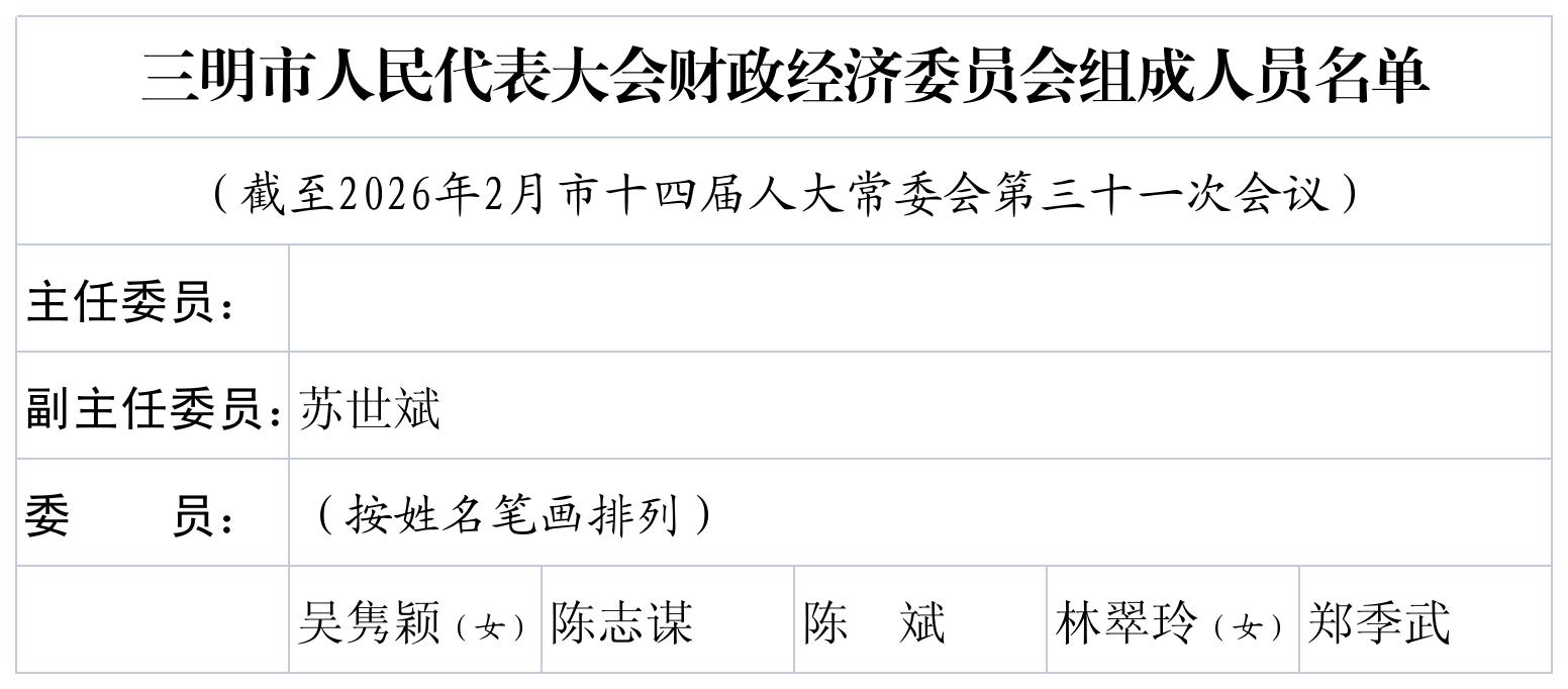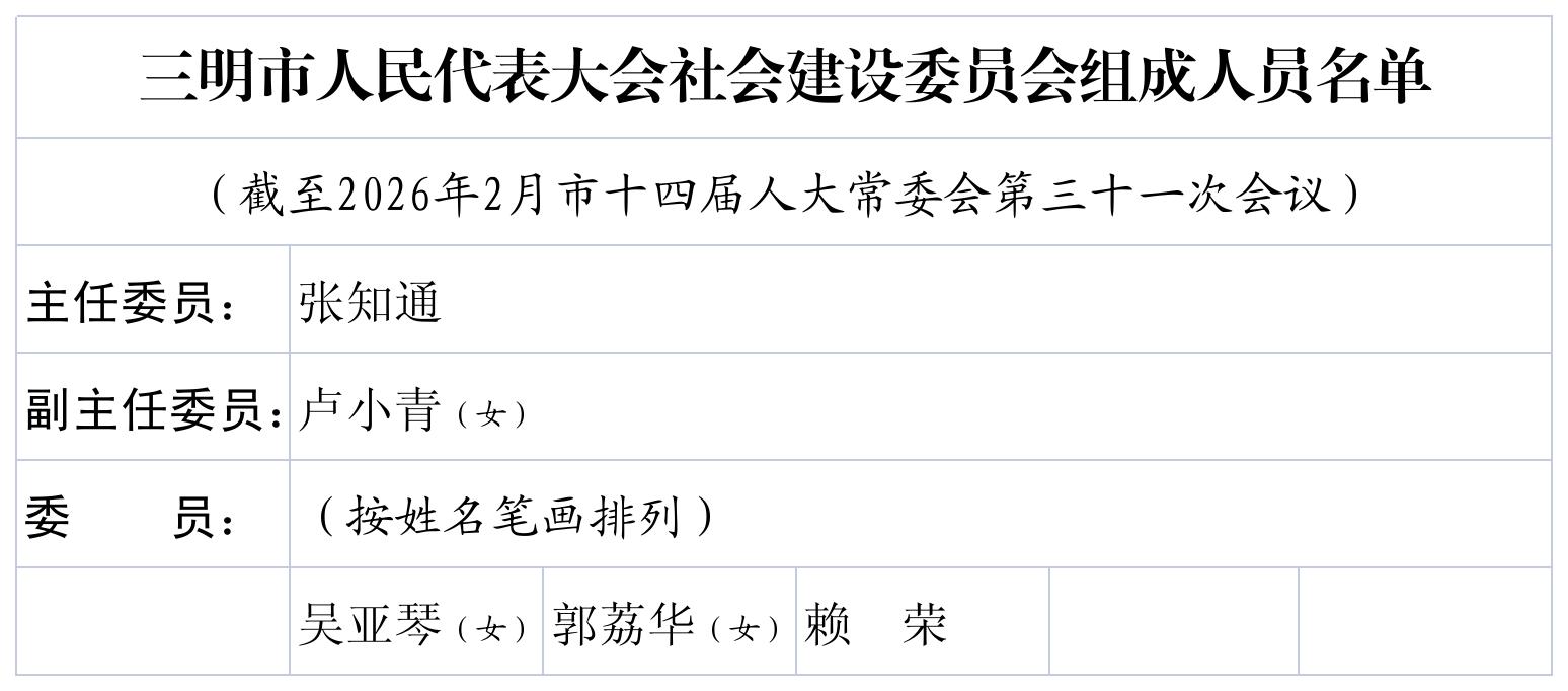 三明市第十四届人民代表大会设立四个专门委员会:法制委员会、财政经济委员会、监察和司法委员会、社会建设委员会。各专门委员会组成人员名单及职责如下: